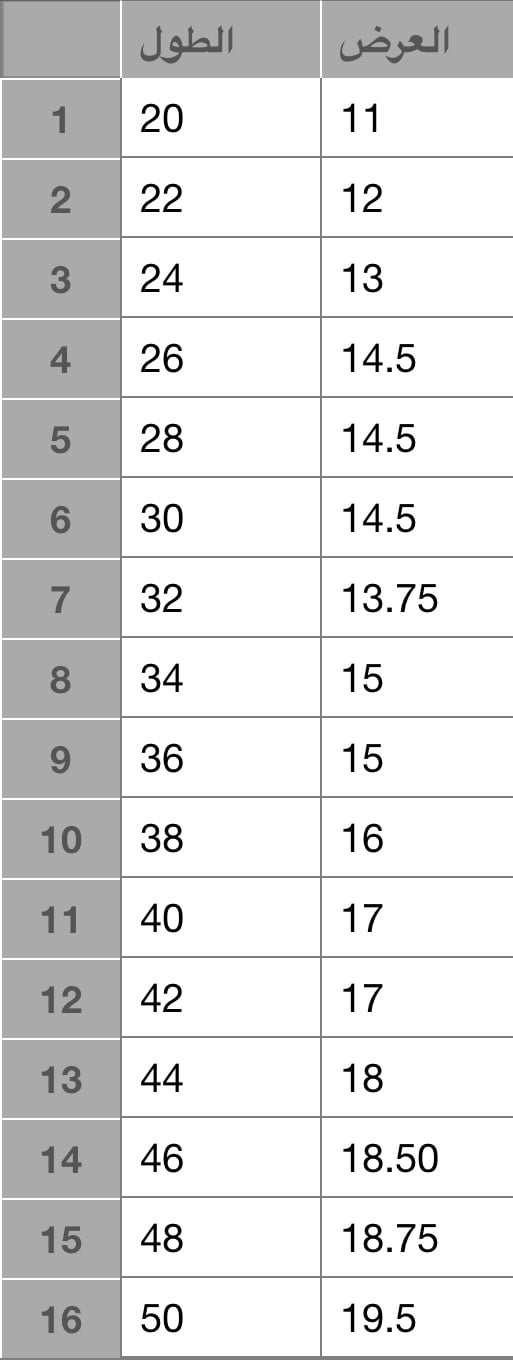 مقاسات الدقل بالإنش من الكتف الى القدم